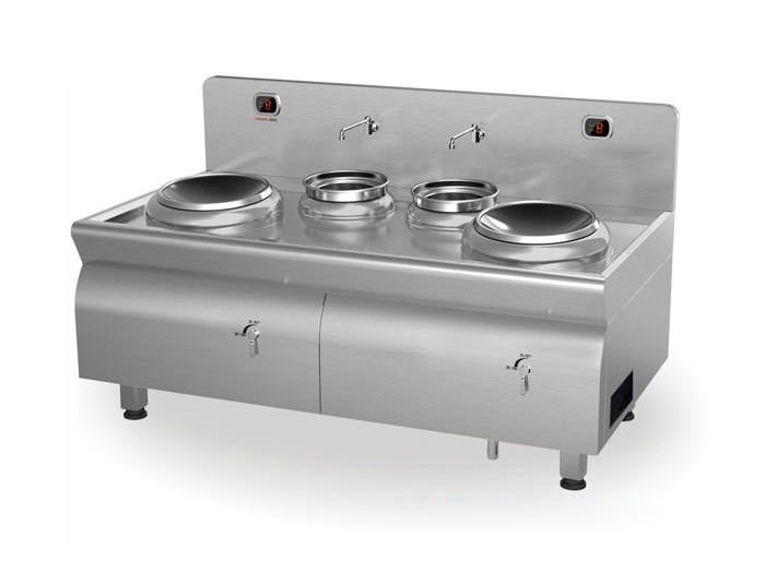 商用电磁小炒炉作为商用电磁炉中的一种新型炉(灶)具。其特殊的工作原理打破了传统的明火烹调方式,采用磁场感应电流(又称涡流)的加热原理,电磁炉热源的产生是通过电子线路板组成部分产生高频电流,由整流电路将50 HZ /60HZ的交流电变成直流电压,再经过控制电路将直流电压转换成频率为20-40KHz的高频电流,通过螺旋状的磁感应圈,形成高频交变磁场,当磁场内的磁力线通过金属器皿(导磁又称导电材料)加热部位金属体内产生交变的电流(即涡流),涡流使锅具铁分子高速无规则运动,分子互相碰撞、摩擦而产生热能使器具本身自行高速发热,从而将电能转换为热能,用来加热和烹饪食物,从而达到煮食的目的.